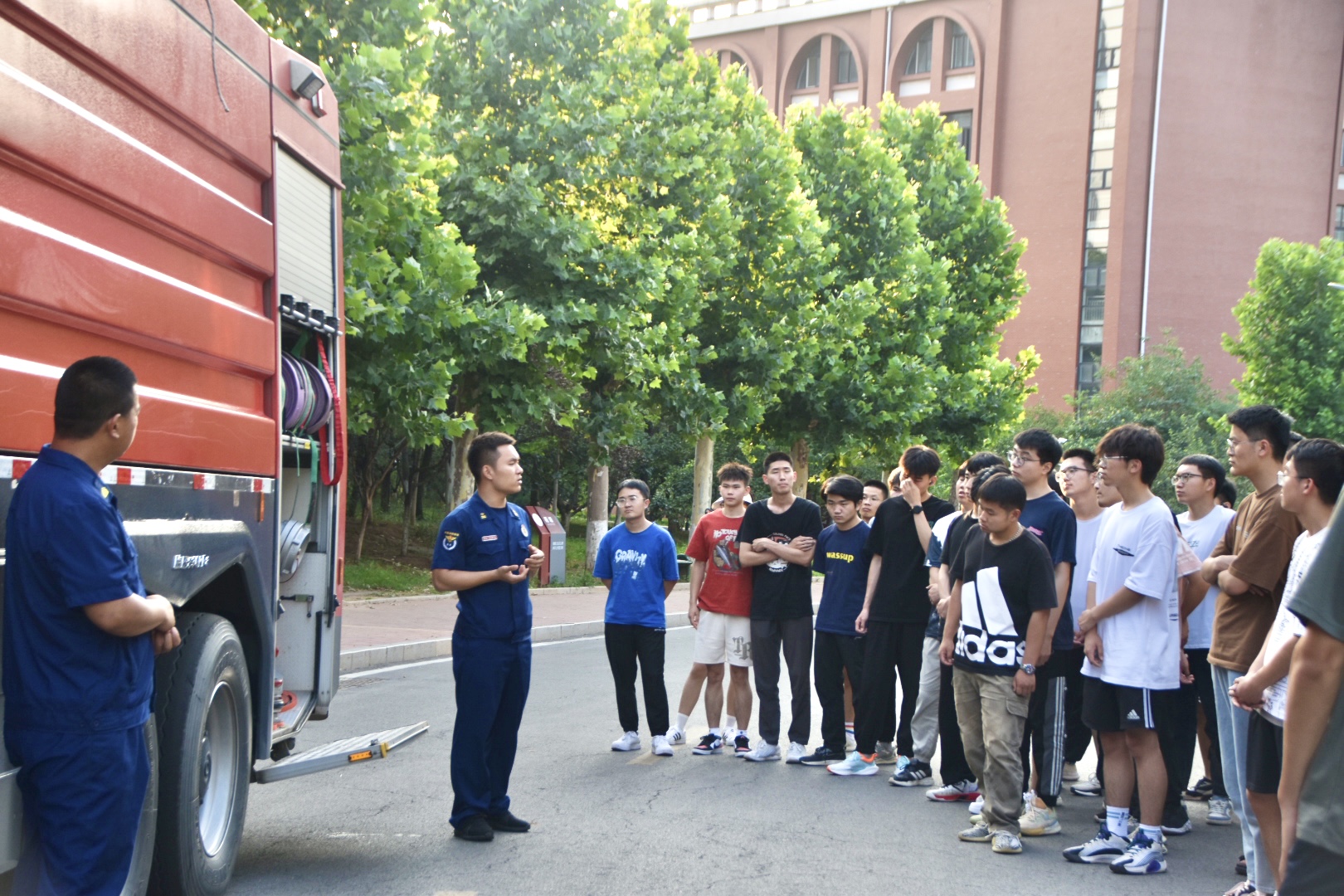 会后,为提高学生应急自救能力,更直观地掌握灭火器材的使用方法,学校邀请孙村消防救援站开展“水罐消防车进校园”活动,并联合开展消防安全演练。活动中,消防队员刘鹏向同学们介绍了水罐消防车各类设备的名称及其功能和常见灭火器的分类与适用火灾类型,并用“提、拔、握、压”四字口诀总结了灭火器的正确使用步骤,讲解了消防水带和消防水枪的使用方法及注意事项。各书院学生积极参与观摩学习,并有50名学生代表参与了灭火器使用演练。