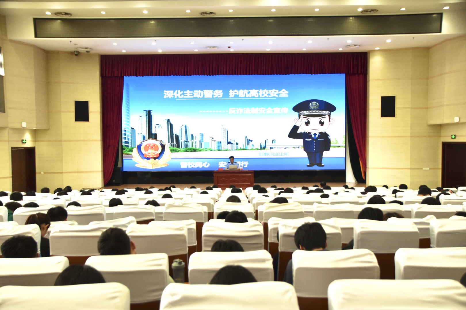 6月20日下午,学校邀请高新区巨野河派出所副所长李子锋来校开展反诈法制宣讲,活动由安全保卫处处长吕鹏主持,学生代表约400人参加。