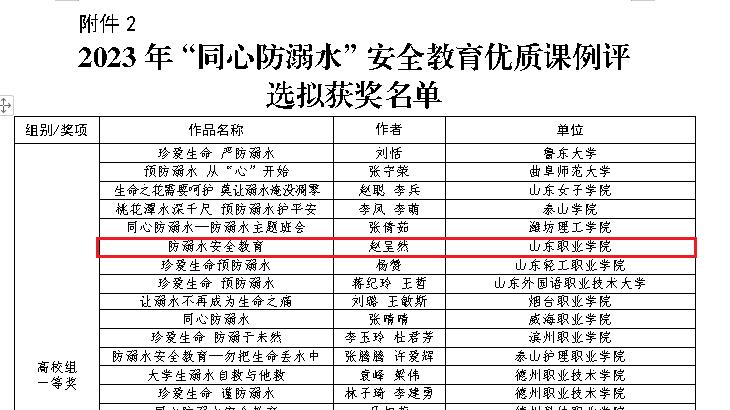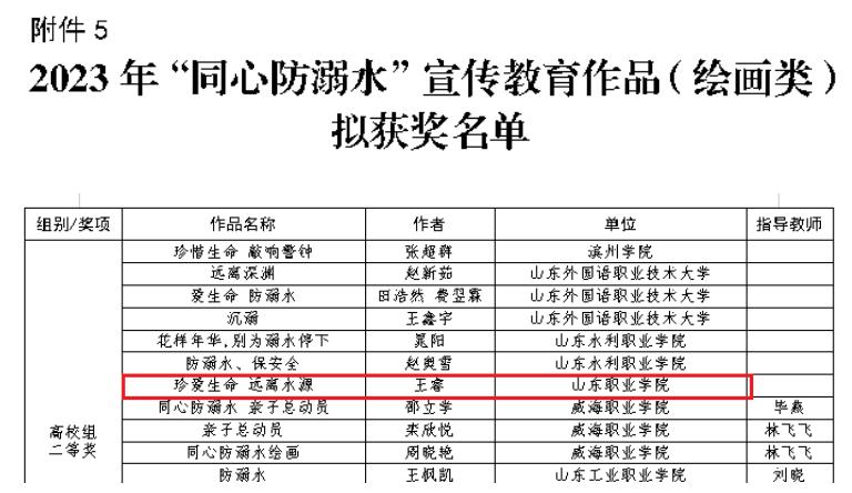 近日,山东省教育厅公示了2023年“同心防溺水”宣传教育优秀作品和安全教育优质课例评选结果,学生工作处报送的桐林书院赵呈然老师的优质课《防溺水安全教育》获安全教育优质课例一等奖,南山书院学生王睿的绘画作品《珍爱生命远离水源》获“同心防溺水”宣传教育作品(绘画类)二等奖。