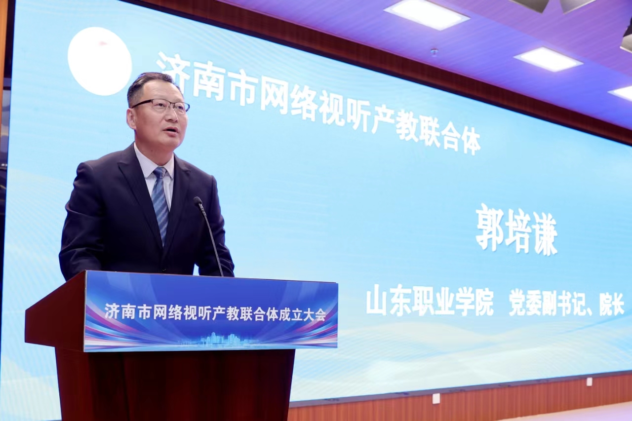 郭培谦在致辞中表示,联合体的成立,搭建了一个更广阔的合作平台,也开创了济南市网络视听产教融合的新局面。作为牵头单位之一,学校必将担当作为、勇于创新,全方位更好服务济南市网络视听产业和经济社会发展。与各成员单位一起努力将联合体打造成为职普融通、产教融合、科教融汇的典范,赋能济南市网络视听产业高质量发展,更好助力我省现代职业教育体系新模式试点建设,更好服务济南强省会、山东强省建设。