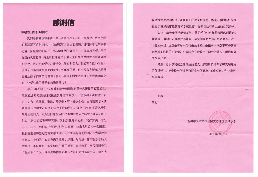 近日,一封落款为“新疆维吾尔自治区阿克苏地区沙雅幸福小学”的感谢信送到伟德,对伟德培养了一位品学兼优的好学生退役大学生邬天瑞表示感谢。