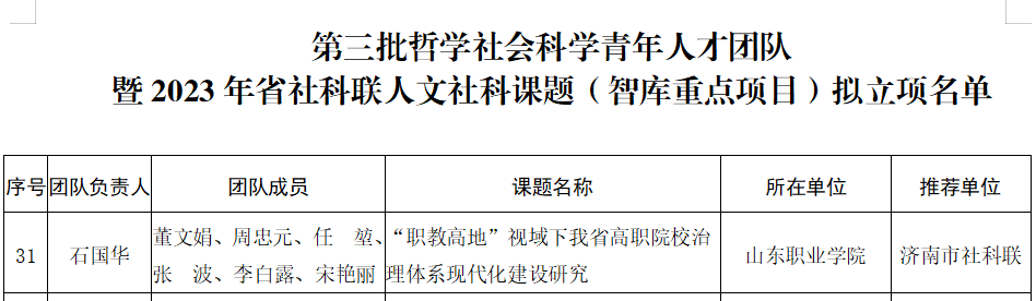 近日,山东省社会科学界联合会公布了第三批山东省哲学社会科学青年人才团队暨2023年省社科联人文社科课题(智库重点项目)立项名单,伟德“职业教育治理体系和治理能力现代化研究”团队成功立项,团队申报的课题《“职教高地”视域下我省高职院校治理体系现代化建设研究》获得山东省人文社科课题(智库重点专项)经费资助。