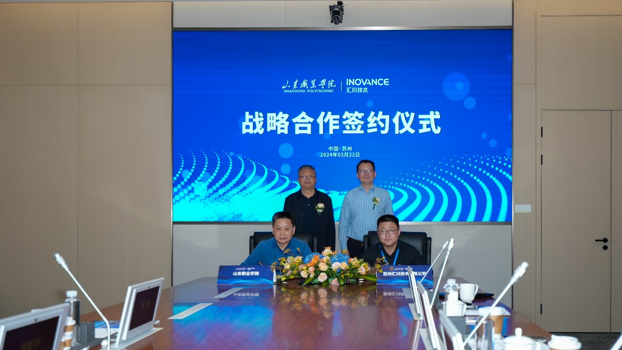 李新华代表学校,与苏州汇川技术签署战略合作协议,双方将本着“优势互补、资源共享、共同发展”原则,围绕工业智能控制、轨道交通等领域开展合作,共建高水平智能制造工程师培训中心,合力打造华北地区创新型人才培养标杆基地。