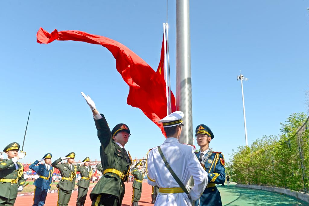 五星红旗在雄壮的国歌声中冉冉升起,全体师生行注目礼,齐唱国歌。