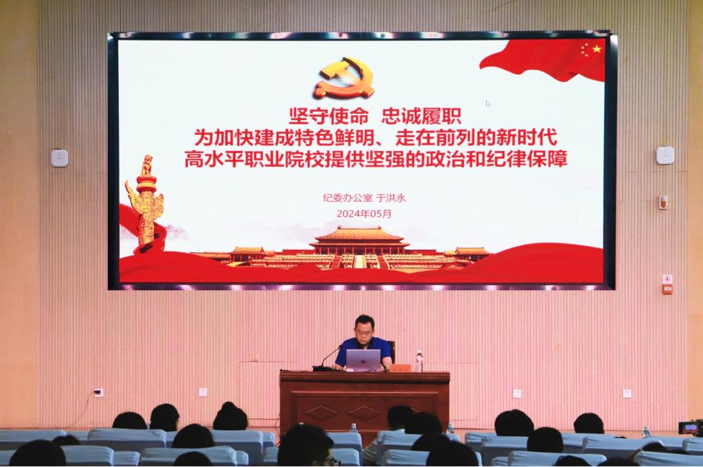 于洪永以《坚守使命 忠诚履职 为加快建成特色鲜明、走在前列的新时代高水平职业院校提供坚强的政治和纪律保障》为题,从纪委的任务与职责、2024年度学校纪检工作重点任务及《中国共产党纪律处分条例》中政治纪律相关内容等进行了全面系统领学和深刻生动地解读,引导党员干部进一步提升认真学纪、全面知纪、对标明纪、笃行守纪的意识水平和能力素质。