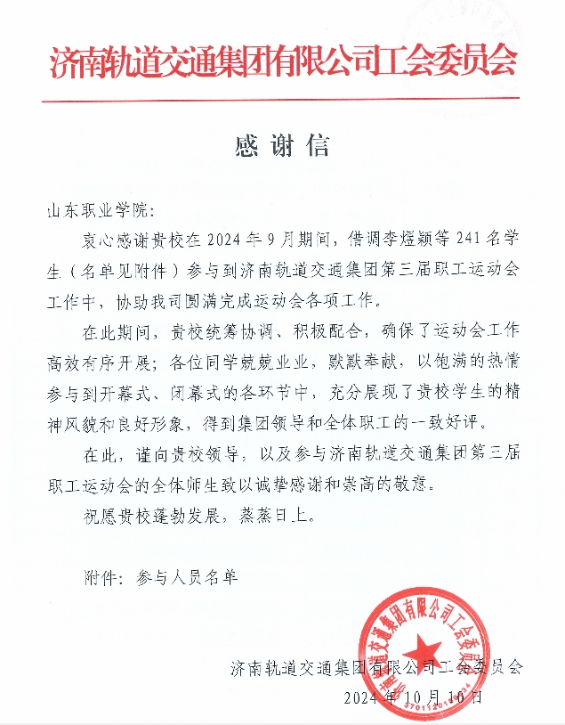 运动会结束后,济南轨道交通集团工会发来感谢信,对伟德的统筹协调、积极配合,学生们的兢兢业业、默默奉献及出色表现表示感谢。