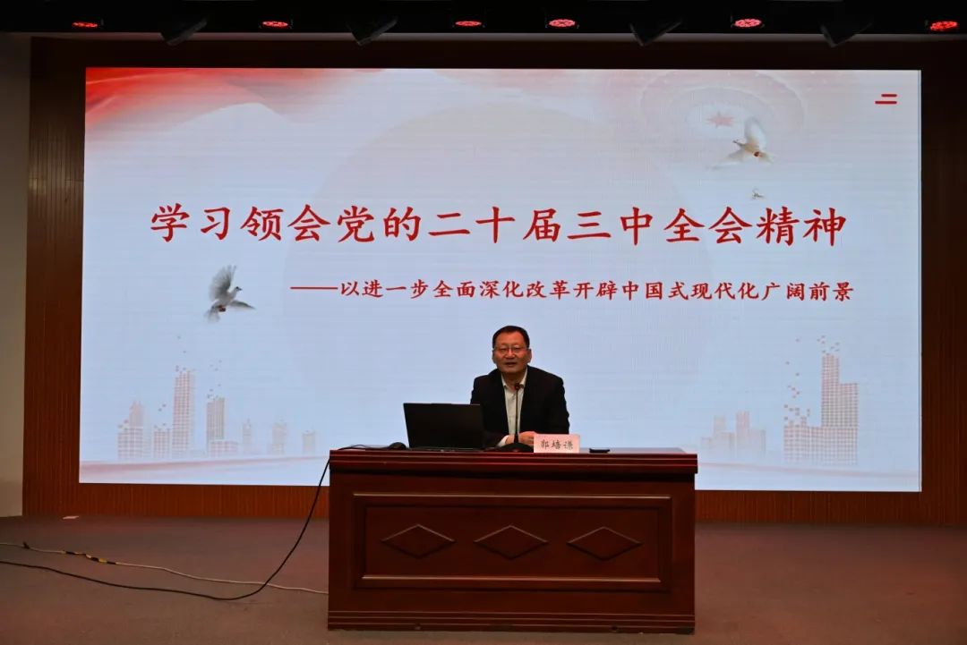 为深入学习贯彻党的二十届三中全会精神,引导广大师生坚守初心使命,12月9日,院长郭培谦在音乐厅讲授专题党课,南山书院师生党员及部分学生代表参加。