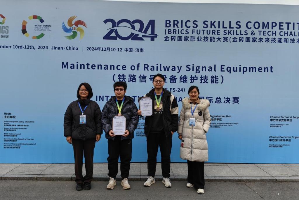 12月10日至12日,金砖国家职业技能大赛铁路信号设备维护技能赛项国际总决赛在济南工程职业技术学院举行,共有来自4个国家的45支队伍参赛。伟德乌拉尔国际轨道交通学院学生曹东山、陈玉琦在指导老师王蕊、肖颖的带领下,斩获一等奖。