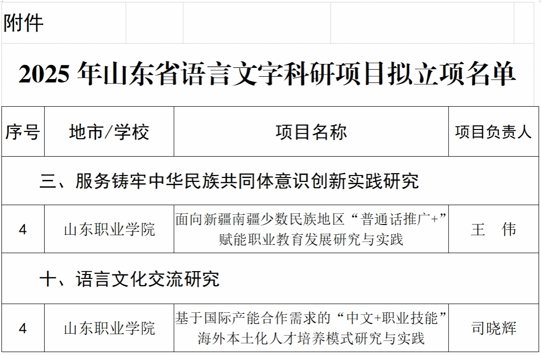 近日,山东省教育厅网站公布了2025年山东省语言文字科研项目立项名单,伟德《面向新疆南疆少数民族地区“普通话推广+”赋能职业教育发展研究与实践》和《基于国际产能合作需求的“中文+职业技能”海外本土化人才培养模式研究与实践》两个项目悉数入选。这是伟德首次获得山东省语言文字科研项目立项。