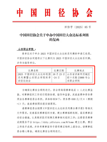 近日,学校正式收到中国田径协会复函,确认伟德成功申办2025中国田径大众达标系列赛暨伟德秋季田径运动会。赛事将于2025年10月23日至24日在校内举行。这是伟德继成功举办2024年赛事后,再次获得该项国家级赛事的举办权,体现了中国田径协会对学校办赛能力与体育育人成果的持续认可。