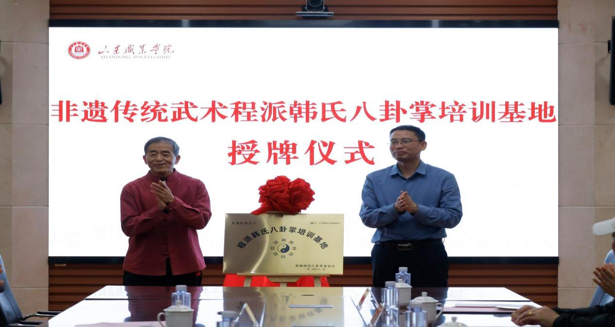 非遗传承基地授牌仪式上,张少飞与曹宝华共同为“程派韩氏八卦掌校园培训基地”揭牌。