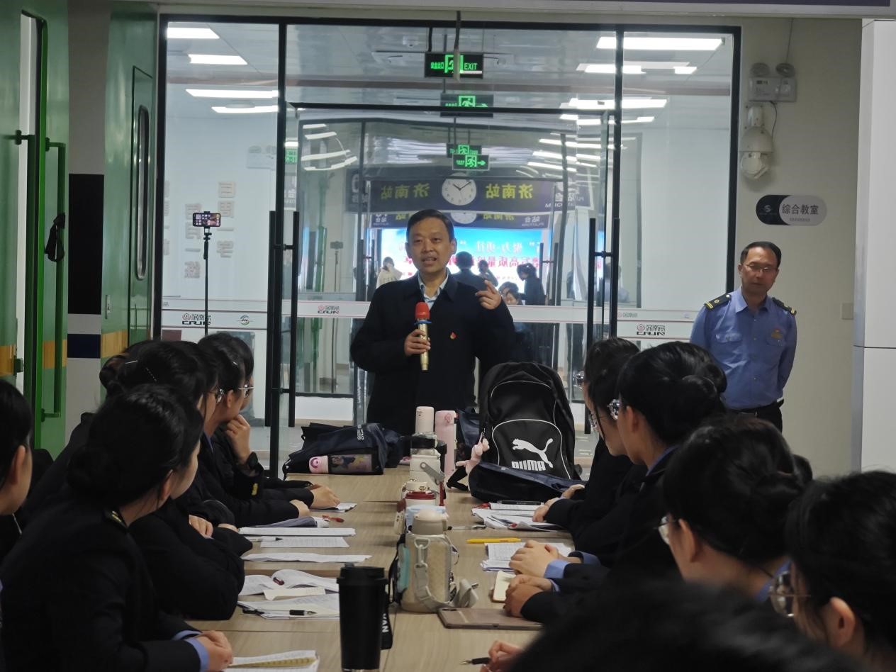 仪式后,客运段领导带领书院师生参观了济南客运段练功场。在现场,伟德22级58名实习生正在进行客运标准化作业演练,学生们扎实的专业技能得到了客运段指导老师的充分肯定。王宁勉励同学们要发扬“勇往直前、敢为人先”的火车头精神,以优秀学长学姐为榜样,努力成长为新时代铁路事业需要的优秀人才。