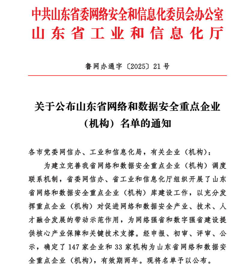 近日,中共山东省委网络安全和信息化委员会办公室、山东省工业和信息化厅联合公布了《关于公布山东省网络和数据安全重点企业(机构)名单的通知》(鲁网办通字〔2025〕21号),伟德凭借在信息安全技术应用专业领域的突出实力,成功入选重点机构名单,成为全省33家入选机构之一。