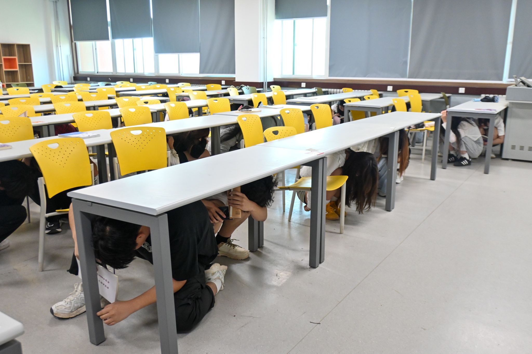 演练前,安全保卫处和各书院制定了详细的演练方案,明确了各岗位职责与疏散流程。14点30分,随着6-10号教学楼消防应急广播的响起,演练正式开启。各书院师生遵循“震时就地避险,震后迅速撤离”原则,迅速反应,用书本抱头躲在课桌旁,就地避险。一分钟后疏散指令下达,在辅导员和志愿者的引导下,学生按照班级座位前后排分别依次从前后门离开教室。撤离过程中,同学们分两列纵队行进,一列贴墙体外侧行进,另一列靠楼梯扶手下行,始终保持弯腰护头姿势,沿预定应急疏散通道快速转移至安全区域集合。各书院辅导员立即清点人数并上报演练情况,整个过程安全快速、规范有序。