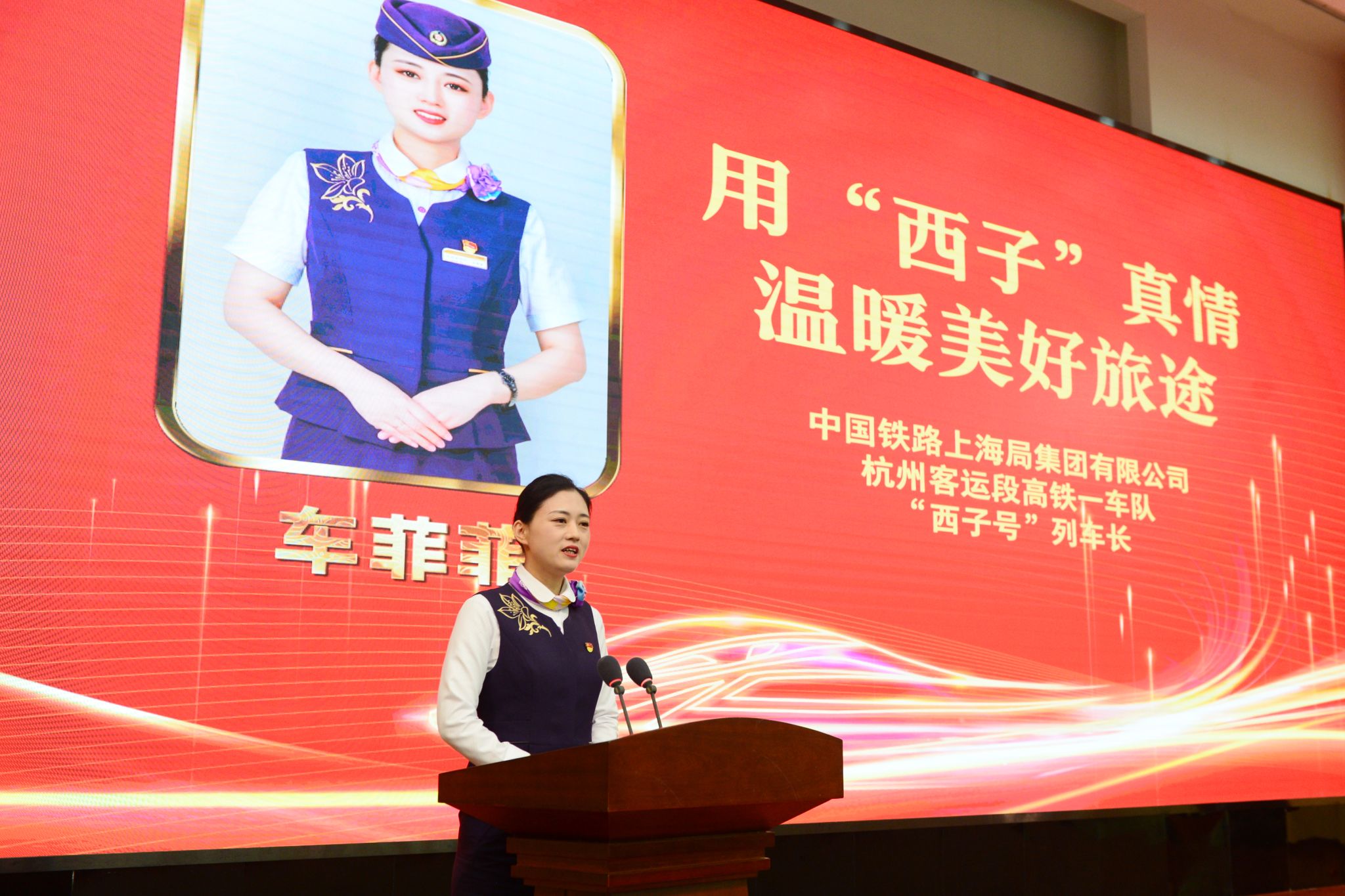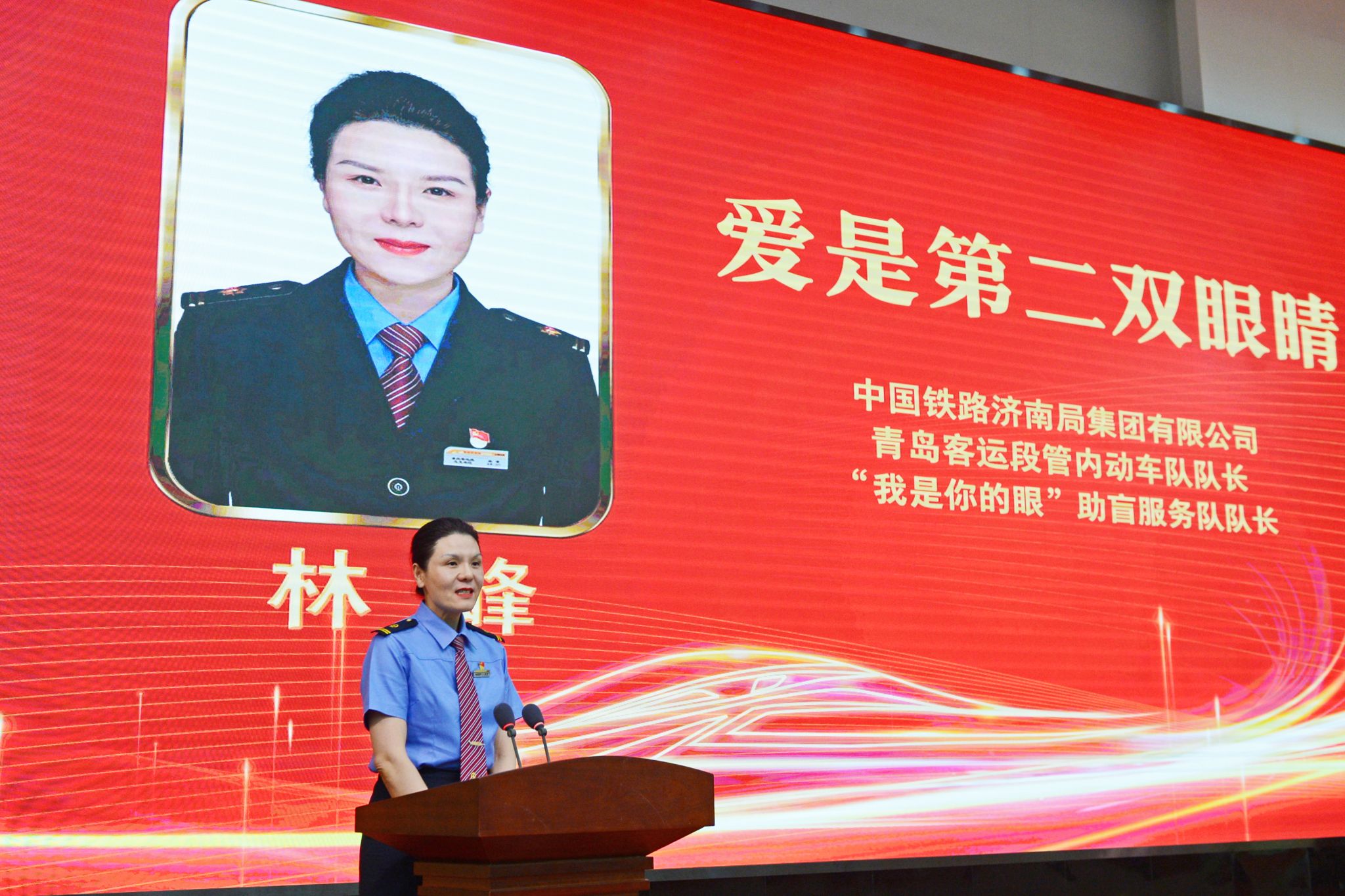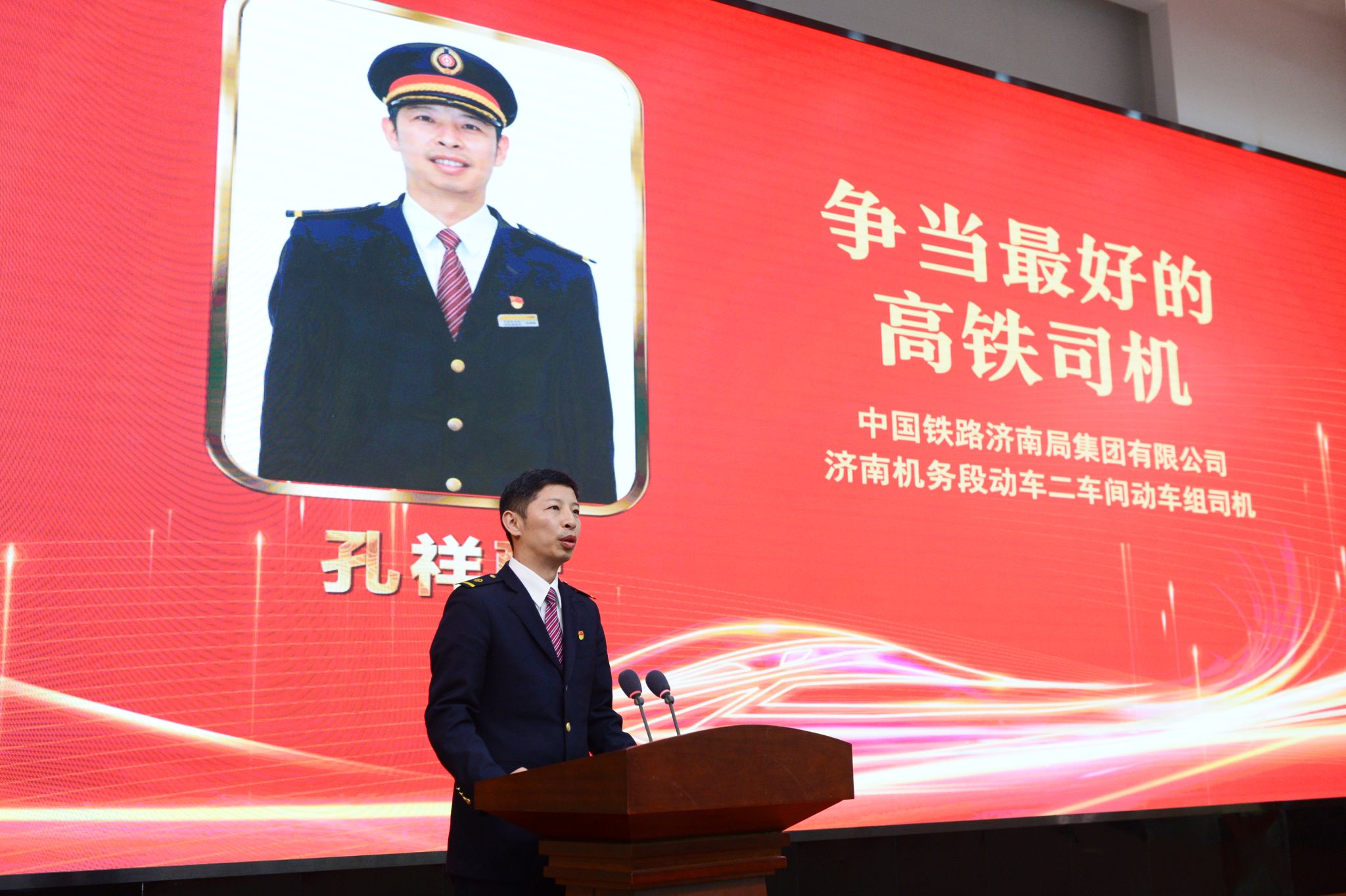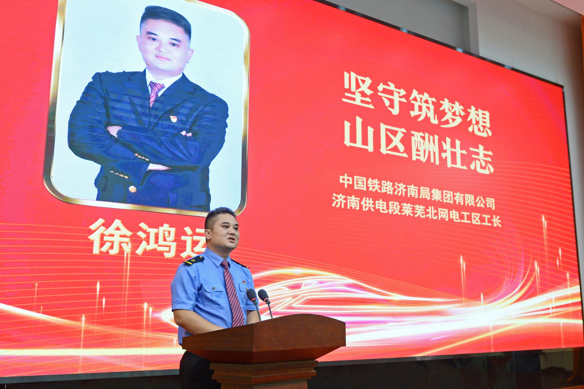 报告会上,济南局集团公司济南机务段动车二车间动车组司机孔祥配、上海局集团公司杭州客运段高铁一车队“西子号”列车长车菲菲、中国中铁高新工业股份九桥工程公司电焊工王中美、济南局集团公司青岛客运段“我是你的眼”助盲服务队队长林峰、济南局集团公司济南供电段莱芜北接触网电力工区工长徐鸿运,向大家深情讲述了坚守平凡岗位、追逐梦想、奉献铁路的感人事迹,情真意切、感人至深、催人奋进,深深打动了在场师生。