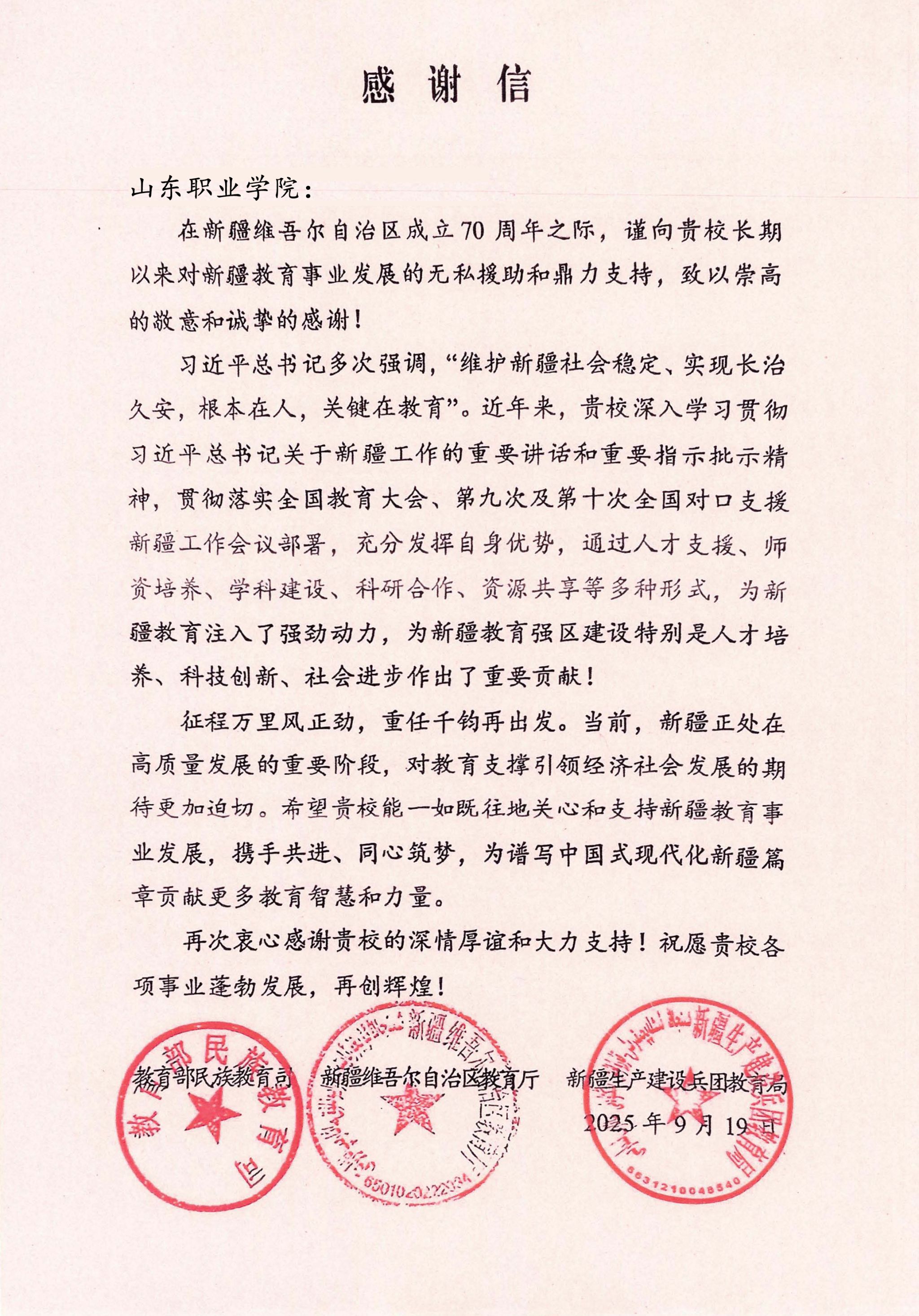 近日,在新疆维吾尔自治区成立70周年这一重要节点,伟德收到来自教育部民族教育司、新疆维吾尔自治区教育厅以及新疆生产建设兵团教育局联合发来的感谢信,向学校长期以来对新疆教育事业发展的援助和支持表示感谢。