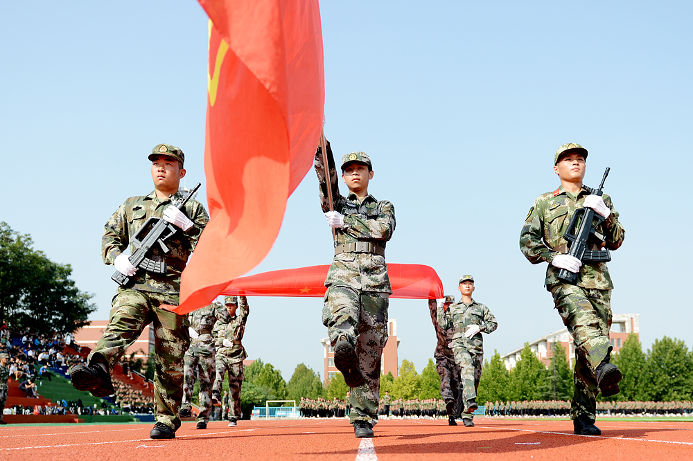 9时30分,新生军训成果展示正式开始。鲜艳的五星红旗在嘹亮的国歌声中冉冉升起,铿锵有力的军乐旋律让每一位新生澎湃不已。