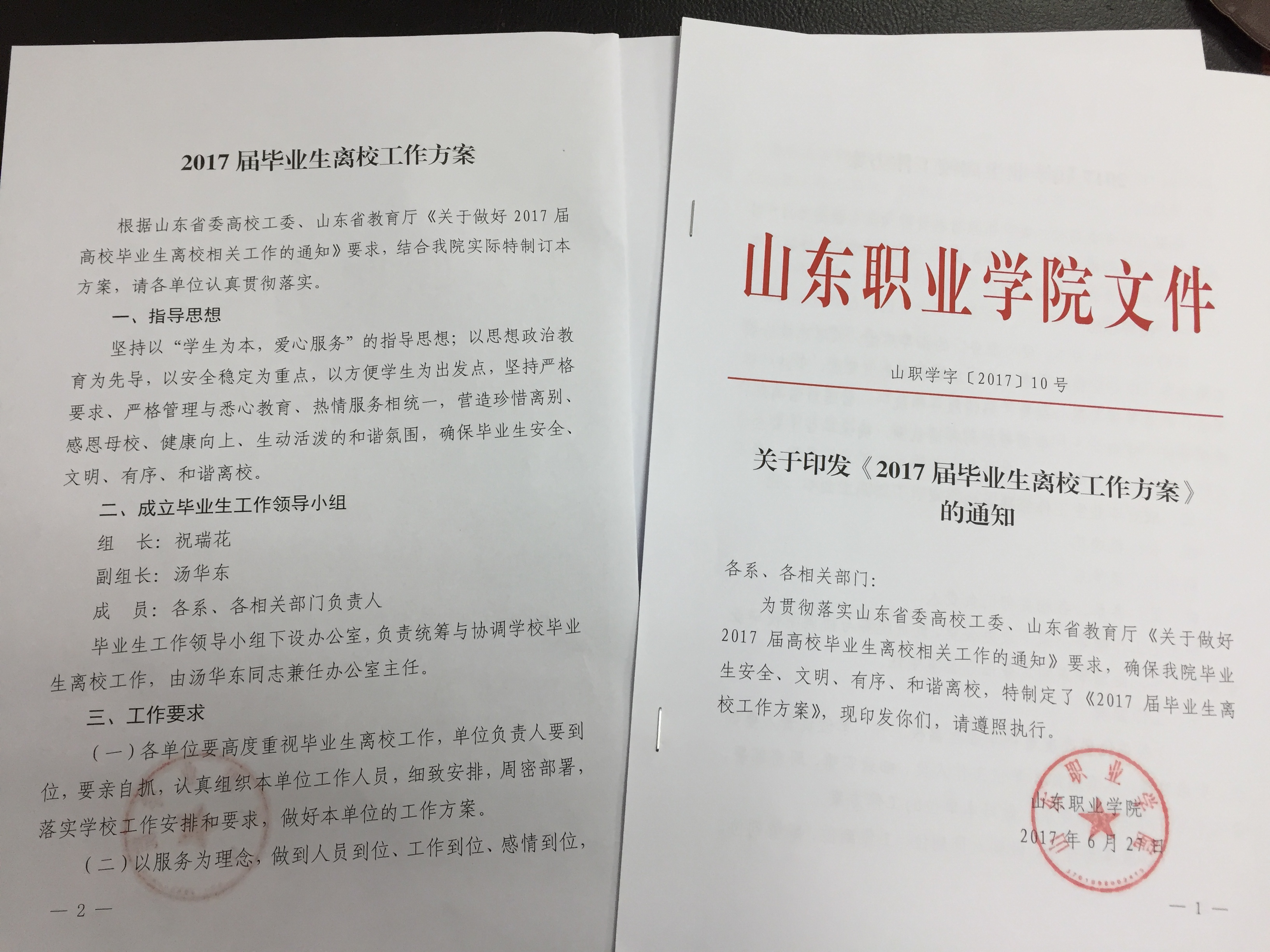 我院高度重视毕业生离校工作,根据省委高校工委、省教育厅《关于做好2017届高校毕业生离校相关工作的通知》,6月21日,学院召开专门会议部署2017届毕业生离校工作。副院长祝瑞花要求各单位、各部门要明确责任、密切配合、热情服务,为毕业生文明离校创造良好条件,同时要加强毕业生安全教育,确保毕业生安全、文明、有序离校。学院还制定了《2017届毕业生离校工作安排》以及切实可行的毕业生教育活动方案,力争把毕业生教育工作落到实处。