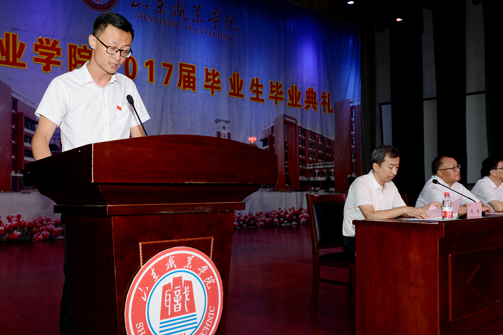 铁道机车专业1439班的王浩代表全体毕业生在发言中感恩母校和师生三年来的辛勤培育,表示将以毕业为新的起点,秉承“知能共进,德道同优”校训精神,在各自的工作岗位上勤于实践、踏实做事,为母校增光添彩,为祖国建设添砖加瓦。