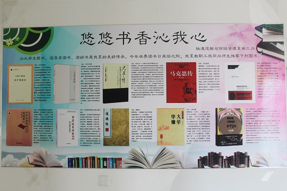 近日,铁道运输与财经管理系“书香沁我心”读书月活动圆满落下帷幕。读书月活动从四月下旬开始,历时三十多天。读书月中各班级纷纷举办了“悠悠书香沁我心”主题班会,教职工向同学推荐二十本“读书书目”,举办了“悠悠书香沁我心”读书心得征文比赛、“我最推崇的主人公” 读书心得演讲比赛、“劳动最光荣”诗文朗诵比赛,开办了“书香沁我心”书法兴趣班以及同学间相互推荐、借阅的“好书共享” 图书“漂流”活动。读书月活动的开展,激发了同学们的阅读兴趣,促进了良好读书习惯的养成,营造出“书香校园”的氛围。