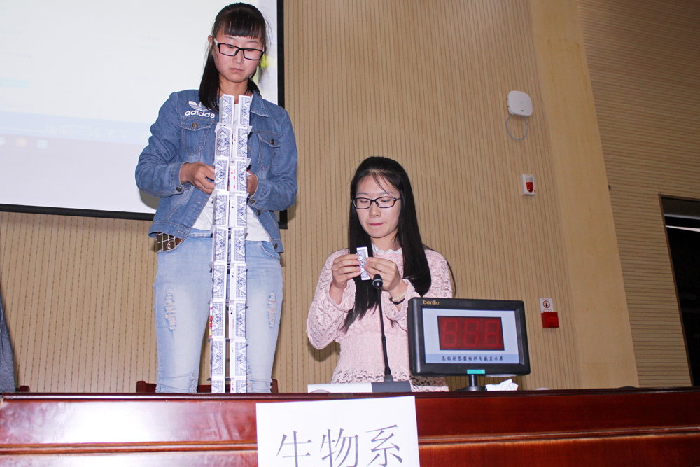 此次校园吉尼斯挑战赛分为益智、技巧、集体、体育四个大类,比赛具体共分为七个项目,分别是“让梦想飞”、“鸡蛋保卫战”、“纸牌摩天轮”、“速度与激情”、“争分夺秒”、“体贴入微”和“暴走呼啦圈”。比赛过程中,参赛选手热情高涨,斗志昂扬,勇于挑战自我,超越极限。在裁判员的指挥下,活动有条不紊的进行着。首先进行的“让梦想飞”,参赛选手用A4纸在规定时间内折出各式各样的纸飞机,他们选取合适的角度,恰当的力度使飞机飞出更远的距离。铁道车辆与机械工程系以20.7米获得此次项目的第一名。在“速度与激情”项目中,选手们结合所学知识和生活经验制作出各种各样的无动力小车,他们将小车沿斜坡下滑,通过重力势能转化为动能后向前行驶。最终铁道工程与土木工程系以24.76米的成绩获得该项目的第一名。在接下来的“鸡蛋保卫战”、“暴走呼啦圈”等项目中,竞技比拼激烈,高潮迭起,每个项目都扣人心弦,成绩卓著,一次次刷出新的记录。最后进行的项目是“纸牌摩天轮”,心思缜密的女选手也巾帼不让须眉,在赛场上依然奋力拼搏。铁道供电与电气工程系以1.2米的成绩获得第一名。比赛选手分工明确、互相配合、相互鼓励,通过完美的配合引发在场同学的阵阵喝彩。活动现场的气氛逐渐攀向高峰,最终比赛圆满落下帷幕。此次活动中铁道供电与电气工程系获得团体总分第一名。