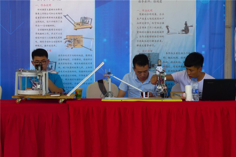 比赛前同学们挑灯夜战,对机器人进行了设计调整和反复调试,赛场上大家团结合作、发挥出色。最终在机器人创意展示项目中杨蕴涵、单宝嘉同学制作的铁路道岔除雪机器人,王昊、杜世峰、单宝嘉同学制作的自动缠树机获得大赛一等奖,杨蕴涵、杜世峰、王昊制作的工厂小能手获得三等奖,在“舞盘雅乐”项目中学院代表队也取得了三等奖的不俗战绩。