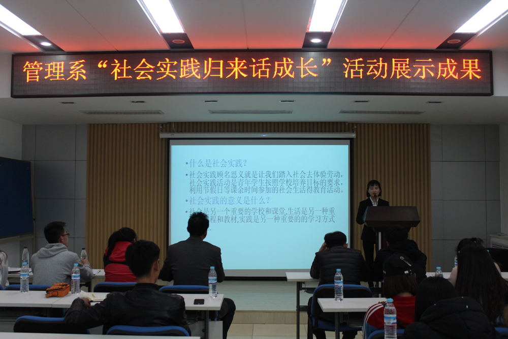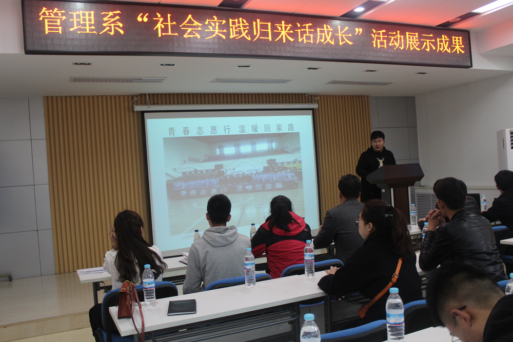 汇报的同学将自己参加社会实践的经历制作成PPT,通过声情并茂的演讲与大家分享实践活动的收获和经验。有的同学讲述了从事铁路志愿者时的经历及感受;有的讲述了从事超市营销员的酸甜苦辣;有的讲述到敬老院志愿服务的得到的感触;还有的讲述了参加商品促销、旅游景点服务、工厂打工等所见所闻、所思所想。一幅幅图片、一个个小故事,深深感动了台下的师生。吕书记在总结讲话中,希望同学们积极参加社会实践和志愿者服务活动,增加社会阅历,成为社会需要的合格人才。