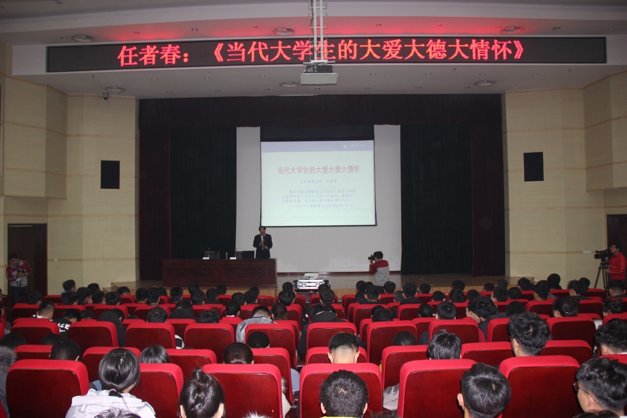 任者春教授从大知、大情、大意志、大行四个方面分别展开论述。大知就是无数小知的有机联系,形成的整体、系统的认知,教导同学们要在知识的联系上下功夫。大情是人之为人的规定,是世间回肠荡气的美丽。有大情,才会有大德,大牺牲,大奉献。不管是伟大的事业,还是平凡的人生都需要大意志,告诫同学不是迷茫,是意志不够坚强。最后任老师督促同学们要积极的行动起来,做一个有行动力的人。