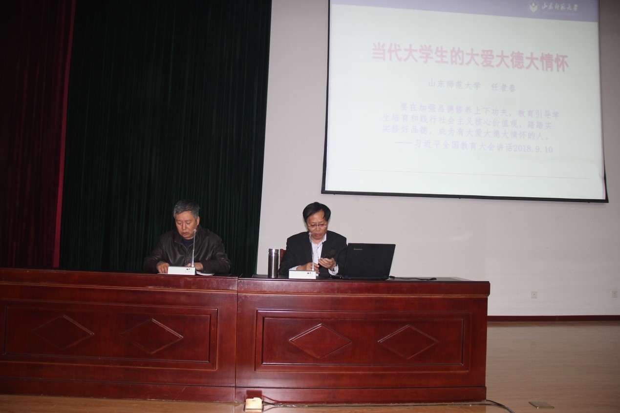 11月27日下午,基础部(思政部)邀请山东师范大学马克思主义学院教授、思想道德教研部主任任者春作《当代大学生的大爱大德大情怀》讲座。讲座由基础部(思政部)主任贾明斌主持,学院党委宣传统战部部长杜树元、副部长杨慧及广大师生参加讲座学习。