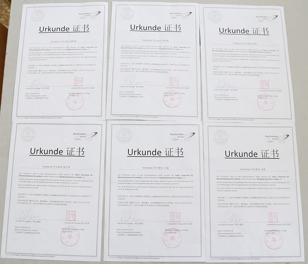 庞继伟在讲话中表示,此次交流活动圆满成功,得到了德国兰茨胡特学院校长及交流生的一致认可,不仅增进了两国的友谊,也为下一次交流合作打下了良好的基础。刘娟表示,希望同学们要努力提高自身专业技能,提高自己的英语口语水平,提高与人合作交流的能力,更要加强自我学习的能力。一位交流生说到,这次中德交流,不仅让他的专业操作水平得到提高,而且深刻领悟到了精益求精、一丝不苟的精神。
