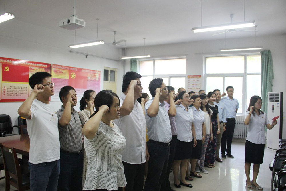 面向鲜红的党旗,全体党员高举右手,声音铿锵,容色坚定,庄严地重温了入党誓词:“我志愿加入中国共产党,拥护党的纲领,遵守党的章程,履行党员义务,执行党的决定,严守党的纪律……”句句千钧,神情庄重地许下对党和人民的承诺。