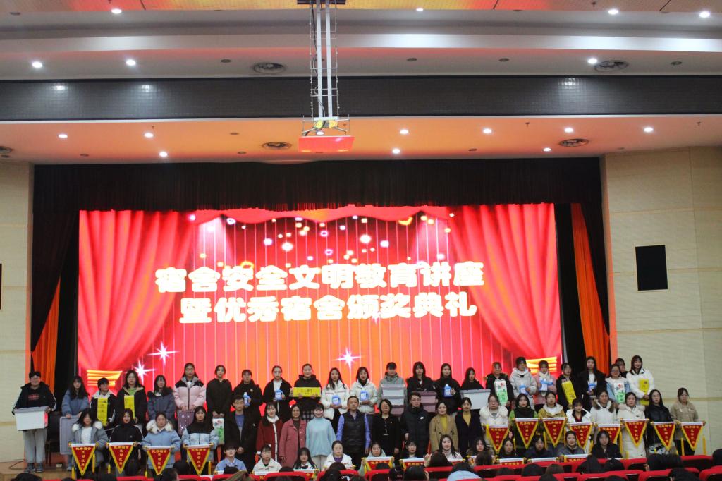 活动最后,全体老师上台为获得优秀宿舍称号的宿舍颁发流动红旗和奖品,并合影留念。