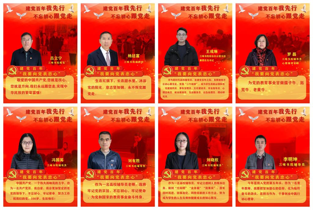 “建党百年——我要向党表忠心”,三味书院教师用实际行动将党的宗旨内化于心、外践于行,通过在线上汇聚成语录的形式将对党说的话献给党与祖国。新时代的师生都应肩负起时代的使命,认真开展党史学习教育,发扬传承党的红色品质,以实际行动和党员的责任担当献礼建党100周年。