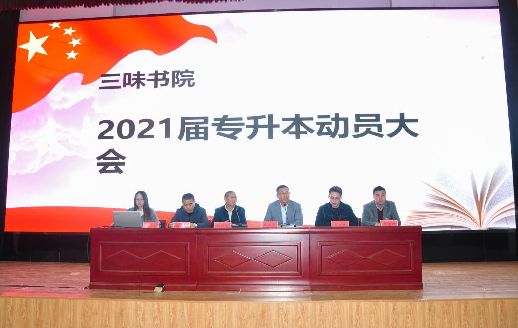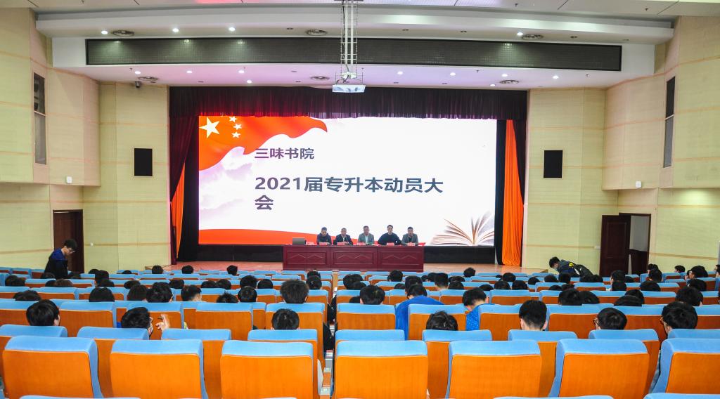 为积极迎接即将到来的2021年统招专升本考试,激发学生自信,鼓舞士气,稳定心态。4月30日,三味书院在图书行政楼西报告厅召开2021年专升本考试动员大会。书院院长吕立宁、副院长杨廷富,书院全体辅导员及2018级专本班学生参加会议,动员大会由书院副院长杨廷富主持。