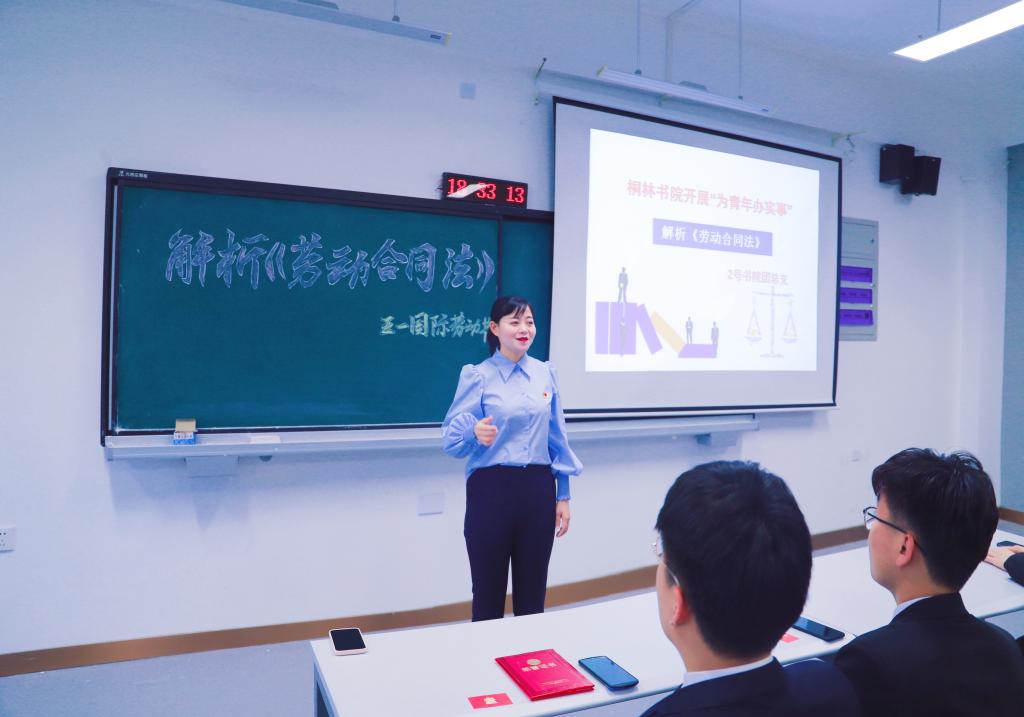 为宣传普及有关劳动合同的相关知识,使即将步入社会工作的学生及时了解有关法律常识。5月7日,桐林书院组织开展“为青年,办实事”活动。活动由书院团总支书记薛高芳主持,书院全体入党积极分子踊跃参加。