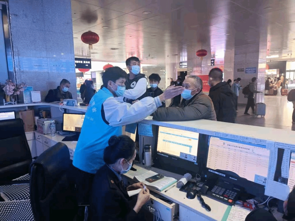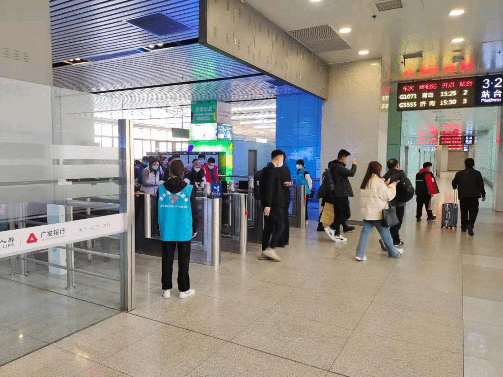 志愿者们分别从进站口、服务台、检票口等多个地方开展志愿服务,从而及时给需要帮助的乘客提供服务。进站口处,为了配合济南站防疫工作,志愿者们仔细检查乘客的健康码,确保乘客出行安全;服务台处,志愿者们为乘客解答问题,并给需要指引方向的乘客提供帮助;检票口处,志愿者们有序检票,最大程度保障乘客们的顺利入站。