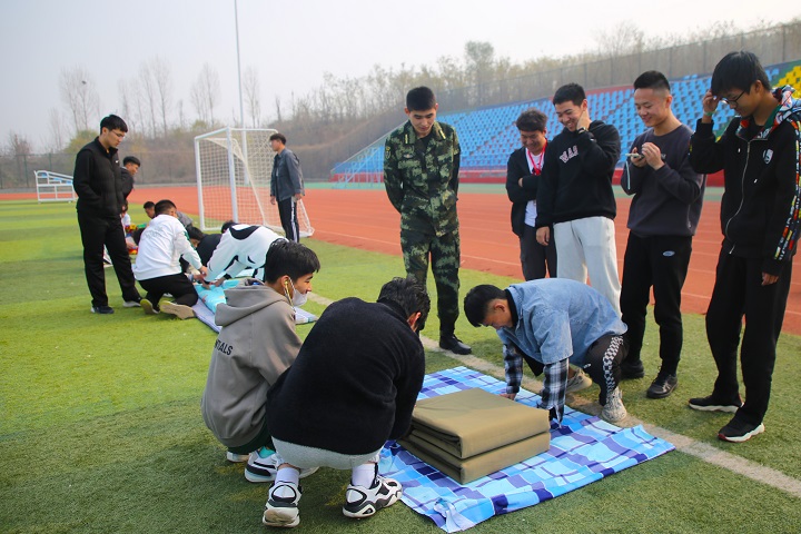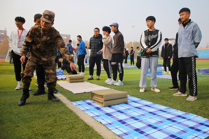 比赛开始前,由退伍军人进行叠被子标准展示,给大赛预热。其后开展各书社叠被子比赛。