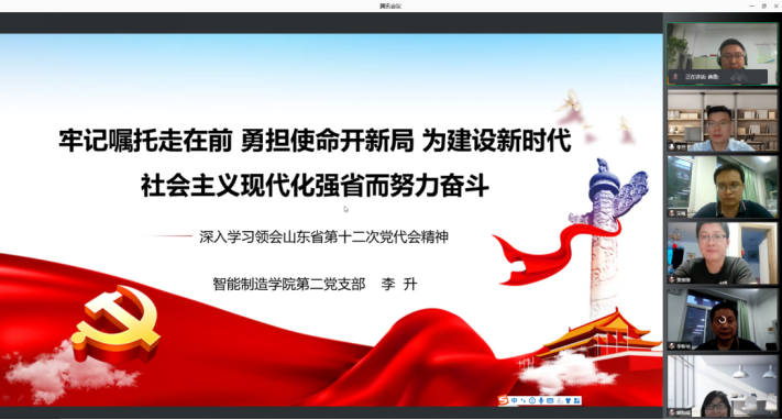 省第十二次党代会于5月28日至6月1日在济南召开,智能制造学院教师李升作为党代表出席本次大会。大会结束后,李升老师在智能制造学院与三味书院共同开展的“深入学习领会山东省第十二次党代会精神”线上主题党课活动中及时传达了大会精神。智能制造学院和三味书院全体党员教师,三味书院入党积极分子100余人参加了活动。活动由智能制造学院党总支副书记唐勇主持。