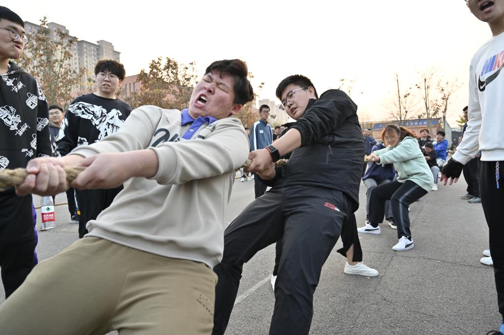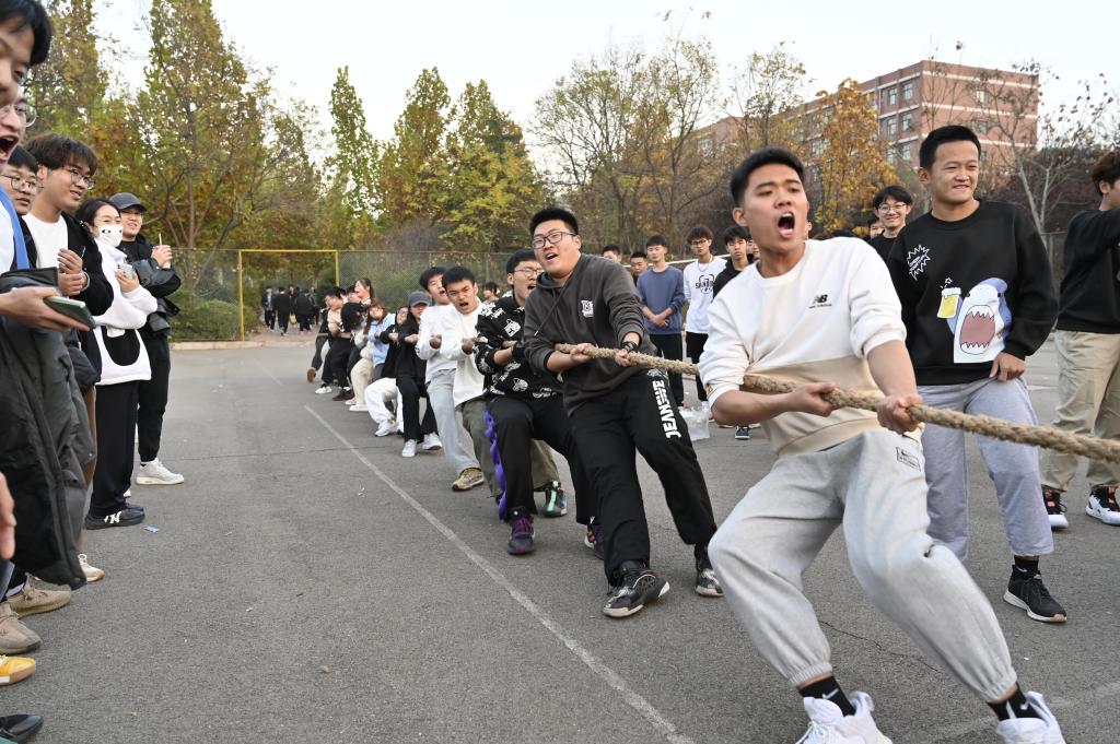比赛打响,参赛选手紧握长绳,齐声高呼“一二,一二”,憋足力气拼命往后拉;场下啦啦队员为队员加油助威,呐喊声此起彼伏。一根小小的绳子在此刻凝聚了众人的力气,汇成一股强大的力量所向披靡。