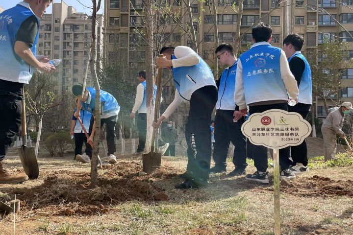 阳春三月,春意盎然。为更好弘扬雷锋精神,践行初心使命,在第45个植树节来临之际,3月11日,三味书院三叶草社区志愿服务队前往章丘区圣井街道北栗园村、孙村彩虹湖社区开展“为青山增绿 为党旗喝彩”义务植树活动,书院全体辅导员及部分学生志愿者参加活动。