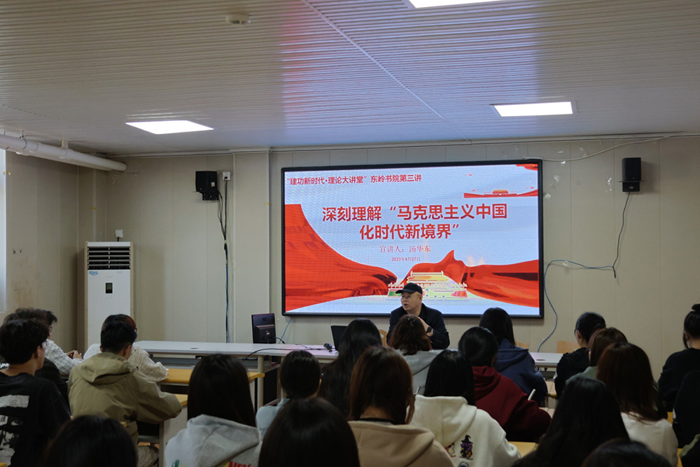 汤华东以《深刻理解“马克思主义中国化时代新境界”》为题,从“开辟马克思主义中国化时代化新境界”概念提出、“开辟马克思主义中国化时代化新境界”哲学含义、“开辟马克思主义中国化时代化新境界”的方法论遵循三个方面讲解,带领同学们回望了党的百年奋斗历程。
