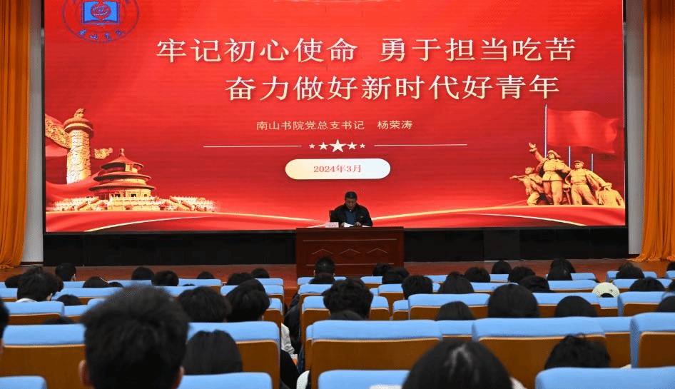 为深入学习宣传贯彻党的二十大精神,坚持不懈用习近平新时代中国特色社会主义思想凝心铸魂,3月7日,南山书院党总支书记杨荣涛在图书行政楼西报告厅讲授“牢记初心使命,勇于担当吃苦,奋力做好新时代好青年”主题党课。书院在校党员、部分入党积极分子以及学生干部参与学习。