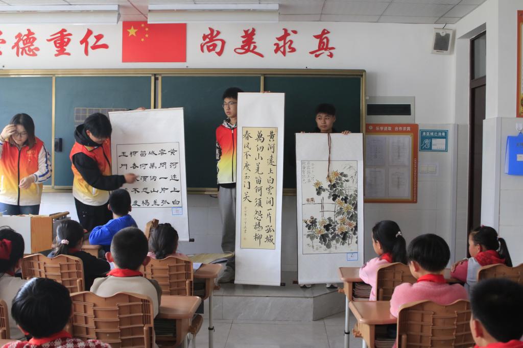 活动现场,志愿者们走进小学班级,为小学生们展示了书法、绘画、篆刻等多种形式的传统文化艺术,并引导他们亲身体验剪纸、国画等非遗传承活动,让大家感受到中华文化的魅力,增强对中华优秀传统文化的文化认同感与文化自信心。