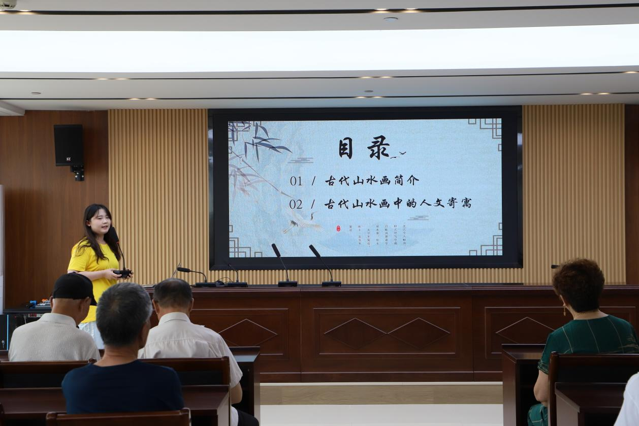 宣讲团成员从古代山水画简介、古代山水画中的人文寄寓、绘画图像艺术的文化价值三部分展开宣讲。通过对中国古代山水画中的元素、主题、构图方法的讲解,引导大家对人与自然山水以及山水万物之间的关系进行思考,赋予山水画多重人文内涵,挖掘其中丰富的文化基因,带领居民深入探索中国绘画的博大精深。