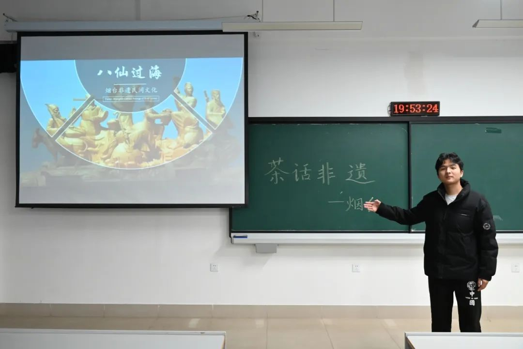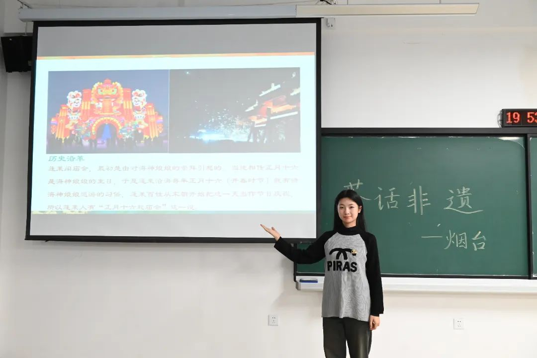 庙会呈史,传承萃华。23512书社苗煜向同学们展示烟台历史悠久的庙会民俗文化,为大家详细讲解了蓬莱阁庙会、烟台毓璜顶庙会、太虚宫燕九节庙会的盛况与特色,展现了烟台丰富的民间艺术、美食和娱乐形式,使同学们感受到烟台人对中华优秀传统文化的坚守和传承。