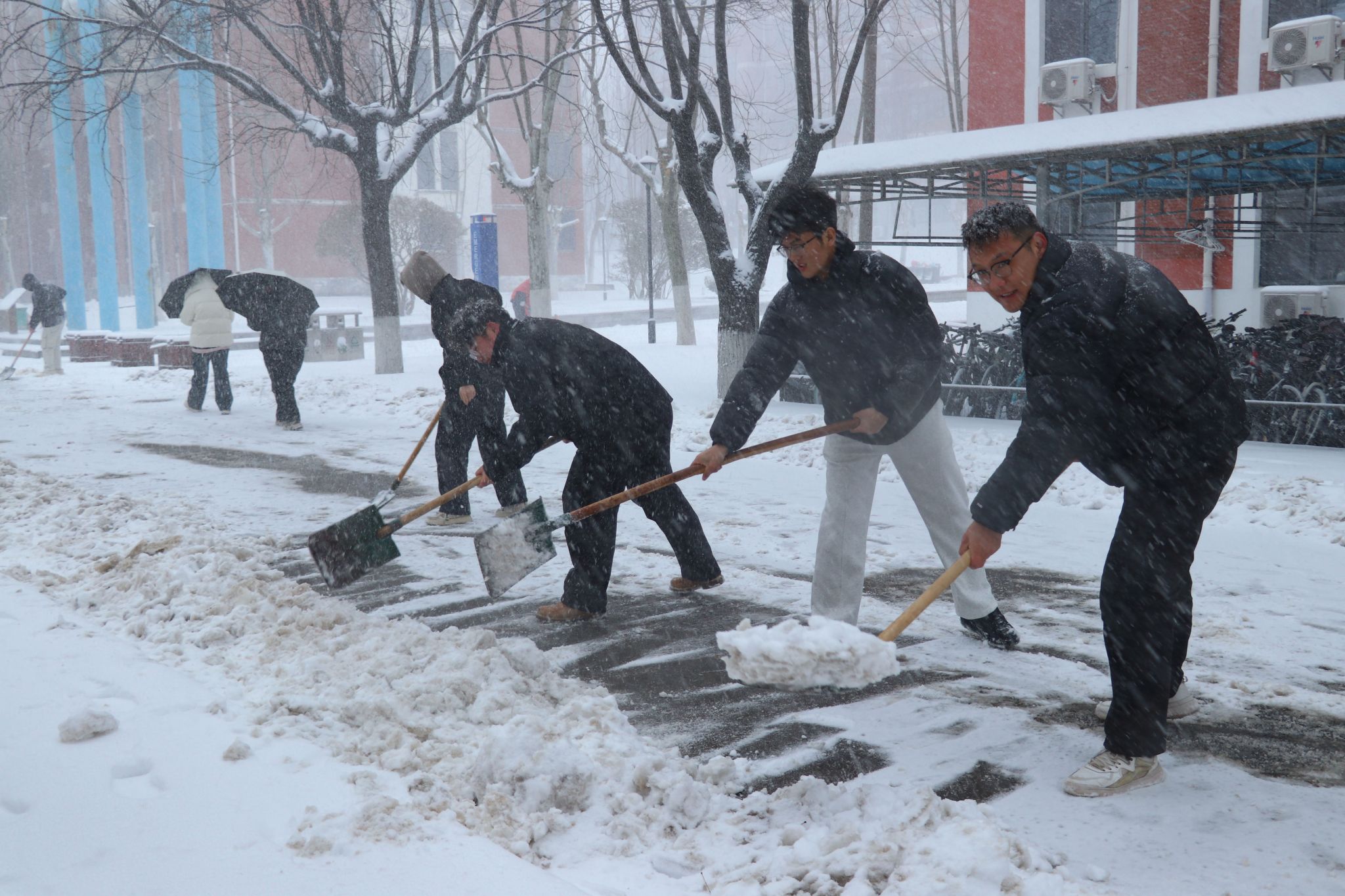 学子们闻雪而动,自发组成6支志愿者小队,手持铁锹、扫帚,在校园各处清理积雪。他们分工协作,铲除主干道积雪、清理台阶暗冰,并用推车清运冰雪。铁锹与地面的摩擦声此起彼伏,展现着同学们高涨的热情。经过数小时努力,一条条方便师生出行的“暖心路”出现在众人眼前。