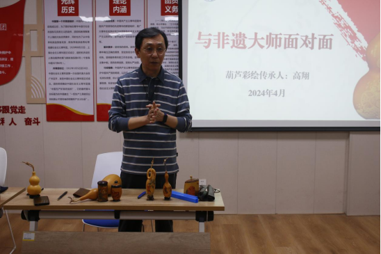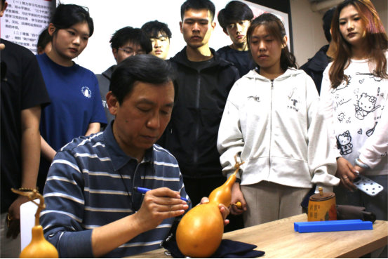 为进一步弘扬中华优秀传统文化,激发学生们对非遗文化保护和传承的兴趣,4月10日,南山书院在10号楼党团活动室举办“与非遗大师面对面”文化体验活动。活动邀请了葫芦彩绘传承人高翔为大家现场讲解。
