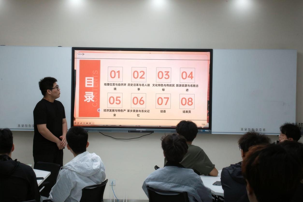 刘海鑫以影像展播的形式开启了介休文化之旅,围绕“听家乡故事、品家乡风物、见家乡新变”三大板块,引导同学们在文化溯源中筑牢乡土情怀。“听家乡故事”板块,他讲解了介休的自然风貌、历史沿革与名人故事,展现“三贤故里”的深厚底蕴。“品家乡风物”部分,他着重介绍了担担面、贯馅糖等承载着介休人民乡愁记忆的特色美食,让同学们对家乡的风物有了更深刻的认识。“见家乡新变”部分,他还向大家介绍了焦化产业集群、非遗琉璃技艺等现代发展成果。