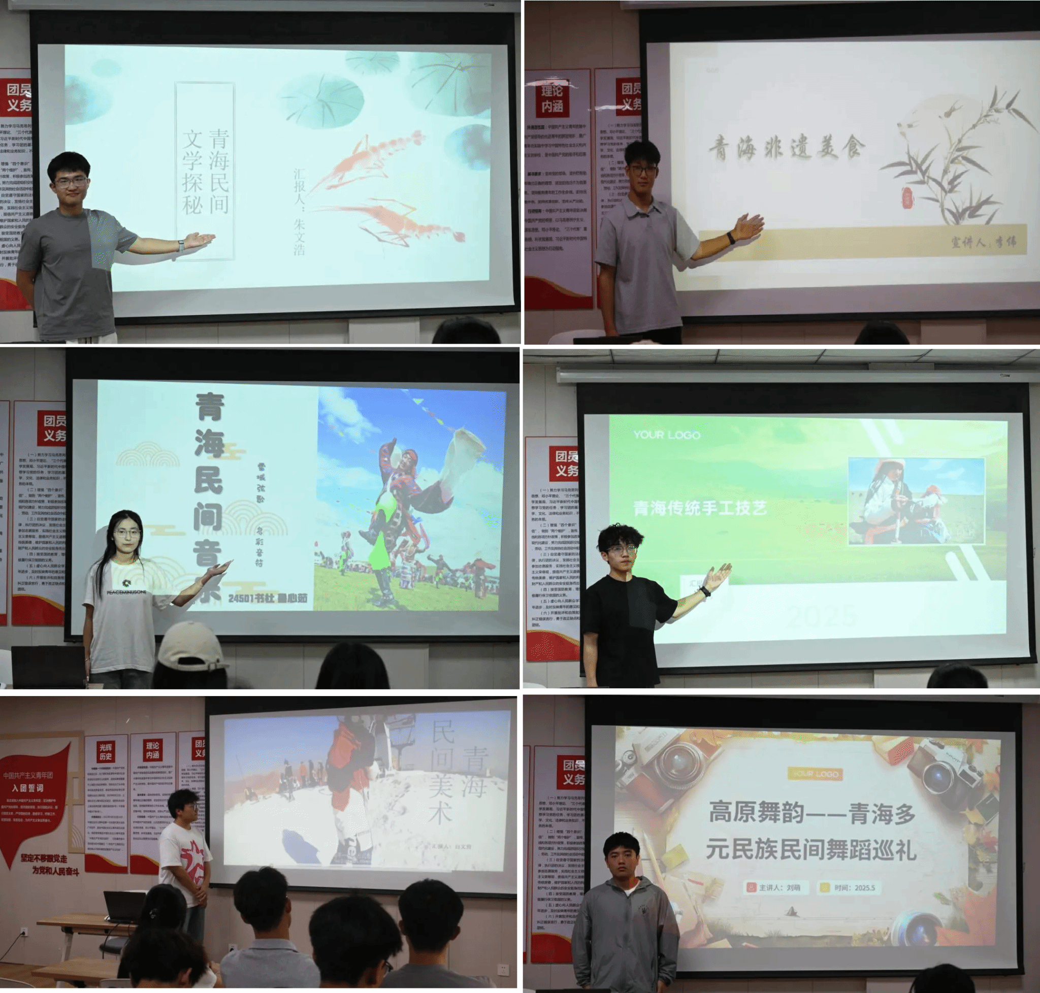 23520书社朱文浩从青海民间文学的起源背景、核心观念、表现形式三个方面为同学们呈现了青海多样的民族语言艺术、文化内涵和精神特质,让同学们体会到青海民间文学的深厚底蕴。23521书社李伟向大家介绍了青海老酸奶、尕面、手抓羊肉和青海土火锅这四种青海特色美食。他从青海特色美食的历史渊源、制作方法、营养价值等方面出发,为大家呈现了一场名为“舌尖上的中国”的美食盛宴。24501书社鲁心茹为大家介绍了汉族民间小调、土族音乐、藏族音乐与回族“花儿”这四种独特的青海民间音乐,通过感受多民族音乐的缤纷韵律,同学们领略到青海大地深厚的民族文化积淀与多元艺术魅力。23521书社的于树旺通过对加牙藏毯、土族盘绣、湟中银铜器和热贡艺术的讲解,使同学们了解到高原上的艺术宝库,让大家对青海深厚的历史底蕴和典雅的民俗风格有了更直观的感受。24501书社的白文哲向大家介绍了河湟农画、唐卡绘画、坛城沙画这三种独特的民间绘画艺术,带领同学们感受青海人民的生活风貌、审美情趣和价值观念,展现了青海民间美术的独特韵味。23510的刘萌向大家介绍了藏族、土族、回族、撒拉族、蒙古族五族的经典舞蹈,通过传统舞蹈与现代网络平台的结合,让更多人深入了解青海舞蹈文化,实现文化的传承与发展。