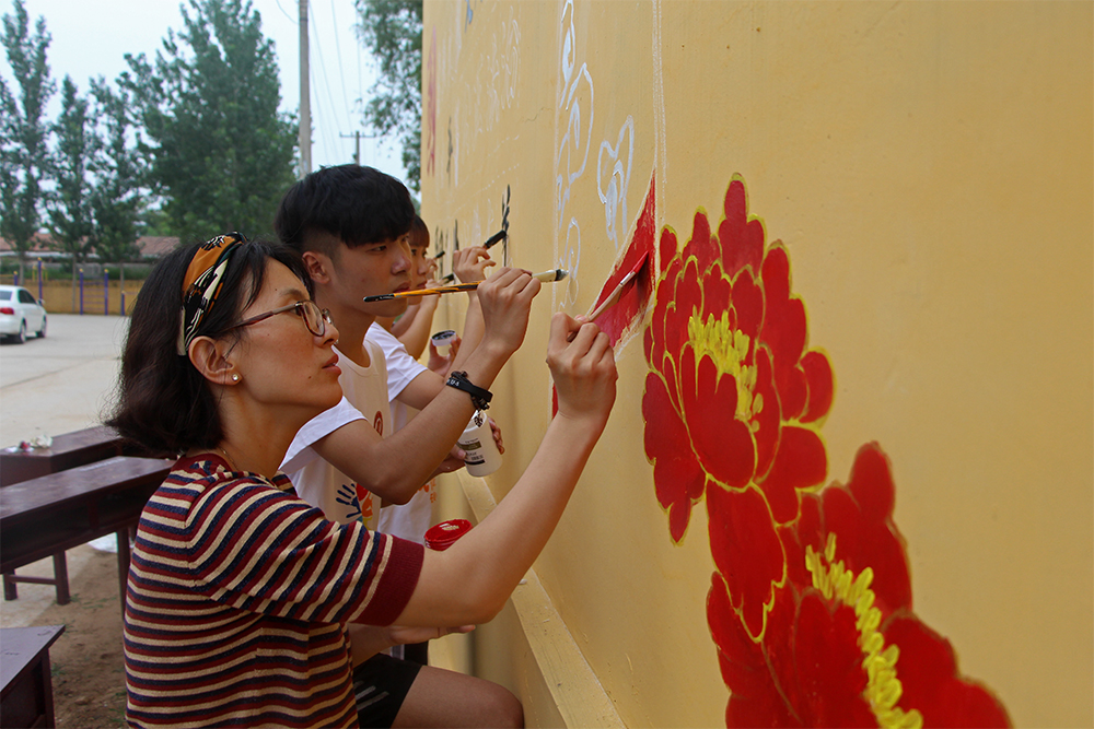 7月11日,“行远筑梦”服务队来到蔺屯村,在村中墙手绘有关“党建、核心主义价值观、家风、尊老爱幼、反腐倡廉”等内容的墙画。服务队的同学们经过精心设计,将原本空白的墙面装饰一新,党徽、国旗、华表、天安门、雷锋等元素跃然于墙上,在美观村委会外观的同时,也传播正能量,让村民开始接收党的理念,知党爱党呵护党。通过此次外围墙的绘画,“行远筑梦”服务队的同学们进一步弘扬党密切联系群众的优良传统,为宣传党的建设贡献出自己的力量。